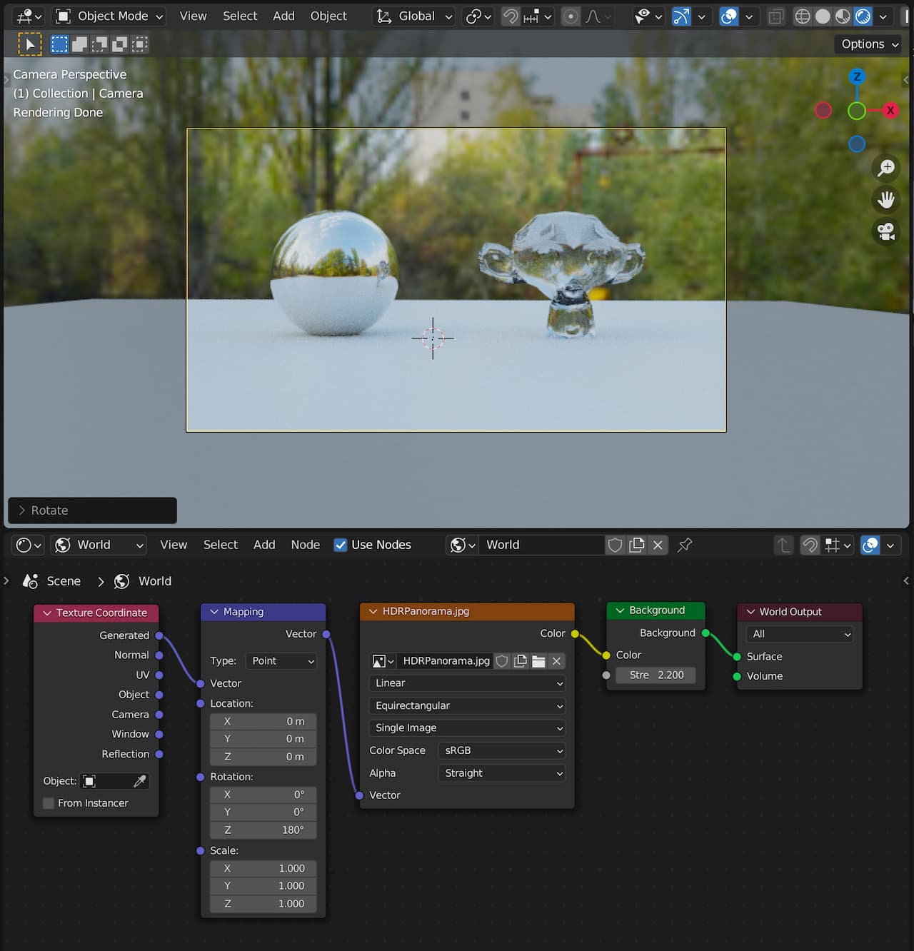 ShaderEditor > Header > World を選択 Add > input > TextureCoordinate Add > vector > Mapping TextureCoordinate の出力 Generated を Mapping の入力 Vector に接続 Mapping の出力 Vector を EnvironmentTexture の入力 Vector に接続 Mapping の Rotation:Z の値を変更