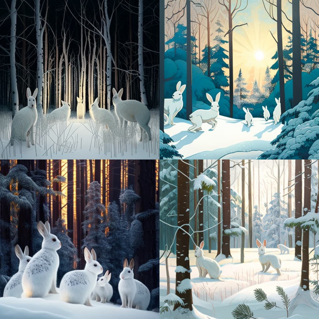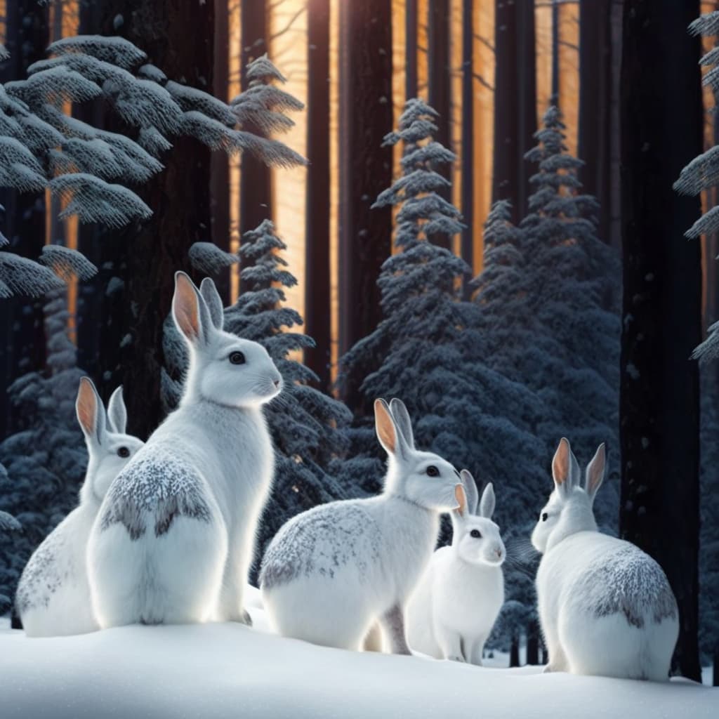 Snowy bright forest, Five white rabbits can be seen in the distance.