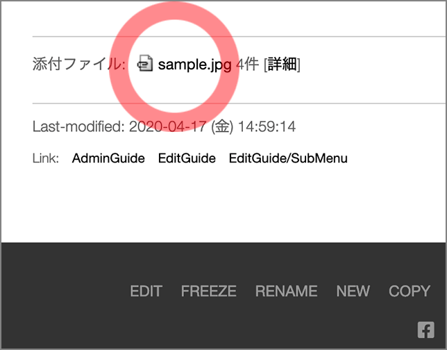 - アップロードが完了すると、ページには、右図のように、画像が添付ファイルとして表示されます。この事例では、「sample.jpg」という名前の画像がページにアップロードされています。