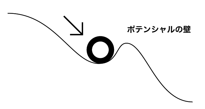ポテンシャルの壁を簡単に説明すると、右の図のようなものです。ボールは基本的には高く不安定な場所から低く安定した場所へと転がるものですが、わずかな突起の存在でも、一定の高さに止まることがあります。この突起がポテンシャルの壁です。