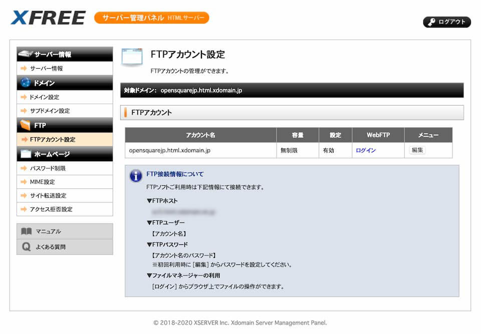 - X-Freeでは、FTPアカウント名は、サイトのURLと同じ文字列が設定されます。これをメモしておきましょう。