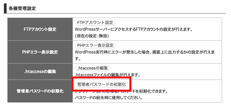 - WordPressのダッシュボードにログインするためのログインIDが表示されていますので、そのまま「パスワードを初期化する」をクリック