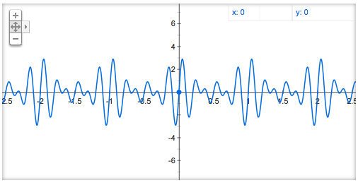 楽器の音(シングルノート)は、基本周波数の f に加えて複数の倍音が同時に鳴ることで、その楽器特有の音色をつくっています。倍音の混ざり方で音色がかわることを波形で見てみましょう。以下、Googleのグラフ機能を使ったものです。表示倍率がそれぞれ異なっていますが、横軸xの値が 0〜1 の間でちょうど1回振動、つまり基本周波数は1であることがわかると思います。