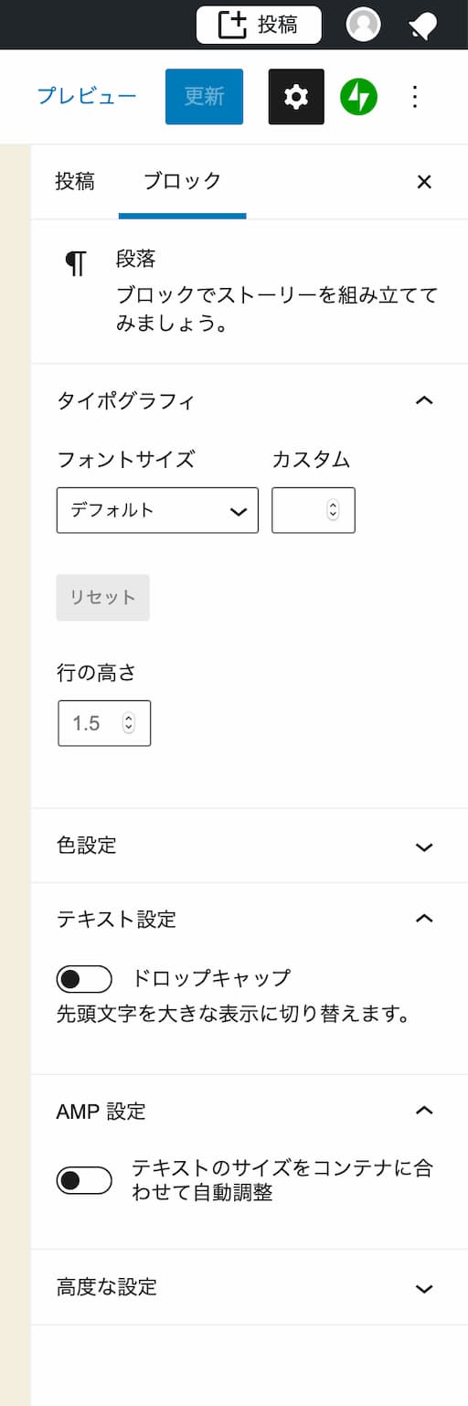 投稿全体や記事内の個々のブロックのスタイルに関する設定が可能です。