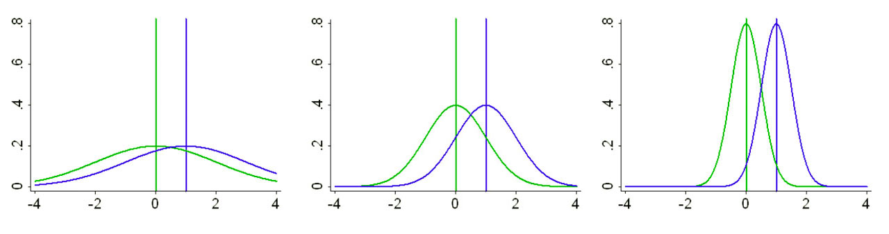平均値の差が同じでも、ばらつき(分散・標準偏差)が異なると、その差が統計的に有意なのか否かが異なります。視覚的なイメージで説明してみましょう。