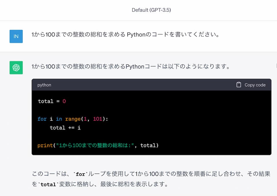 前回、コードの書き方の事例として挙げた「1から100までの整数の総和を求めるプログラム」について、ChatGPTにも聞いてみました。解説つきで回答してくれました。