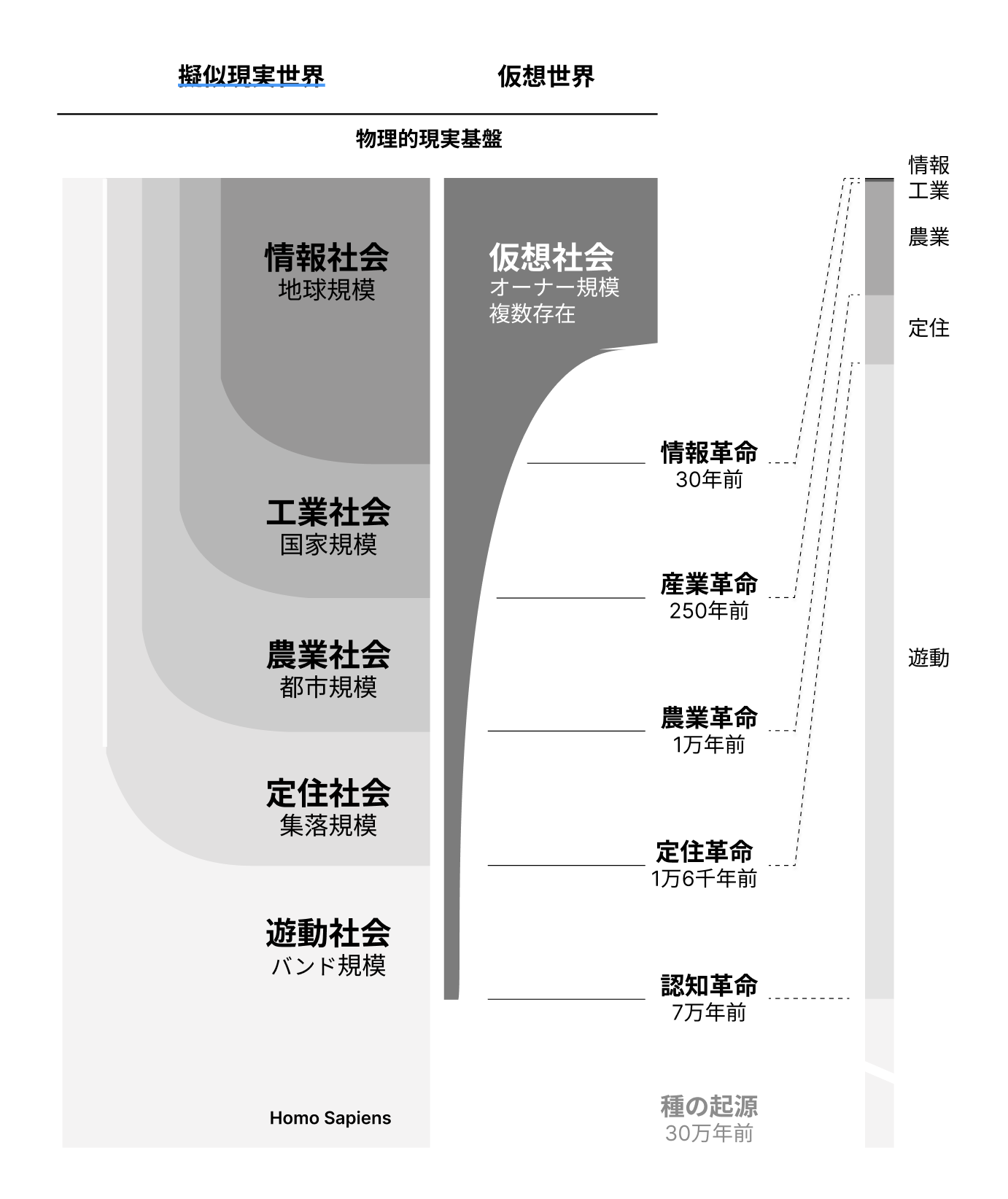 いわゆる「物語世界」という意味での仮想空間は認知革命とともに誕生したが、実在する人間が直接関与する仮想社会は情報革命以後に登場する。そこは物質・エネルギーの制約から解放された規模感不定の社会で、時空間や生死を超越した「もう一人の私」が、アカウント登録によって自我を形成する。