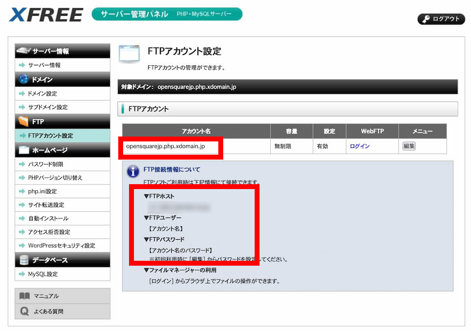 ここでは、X-Free のFTPアカウント設定画面にある WebFTPは使用しない前提で話を進めます。将来のために、FTPクライアントを使ったファイルの転送スキルを身につけることをお勧めします。