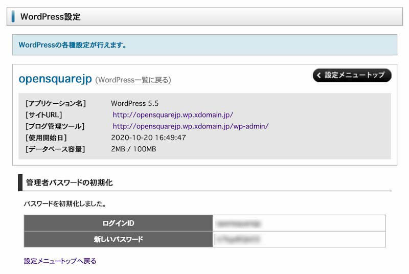 以上で、サイトは公開されていますが、この時点では、ダッシュボードにログインするためのパスワードの情報が得られていません。以下の手順で、WordPressの管理者IDとパスワードを確認する必要があります。