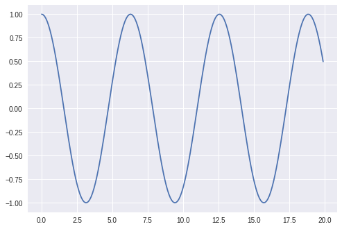 import numpy as np import matplotlib.pyplot as plt x = np.arange(0, 20, 0.1) y = np.cos(x) plt.plot(x,y) plt.show()