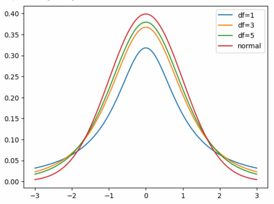はパラメータなしに一意に定まる確率分布ですが、t 分布は母標準偏差が既知であることを前提とせず、自由度(df:Degree of Freedom)をパラメータとして定義されます。自由度は n-1 とされており、これは標本サイズ n に関連しています。