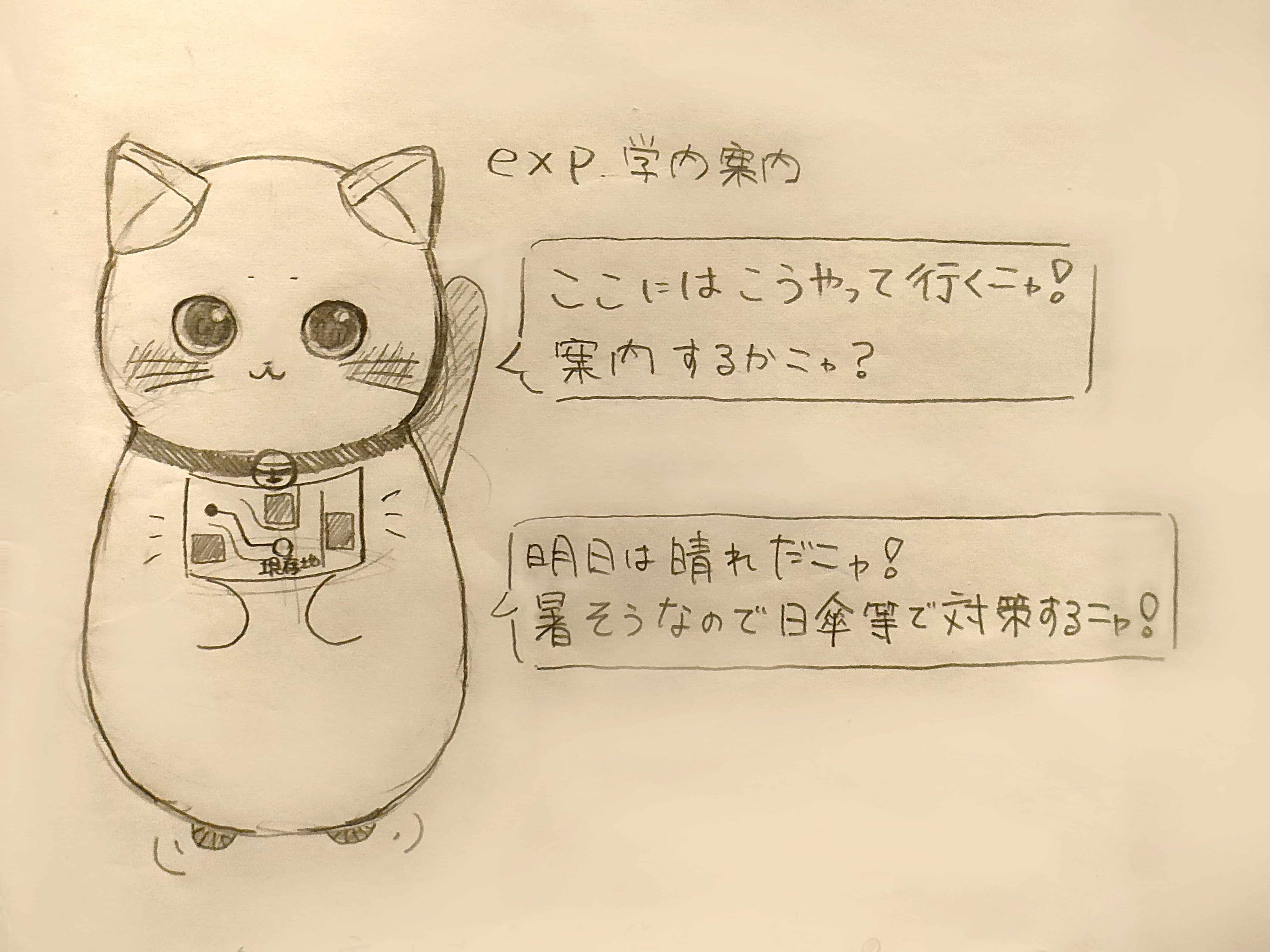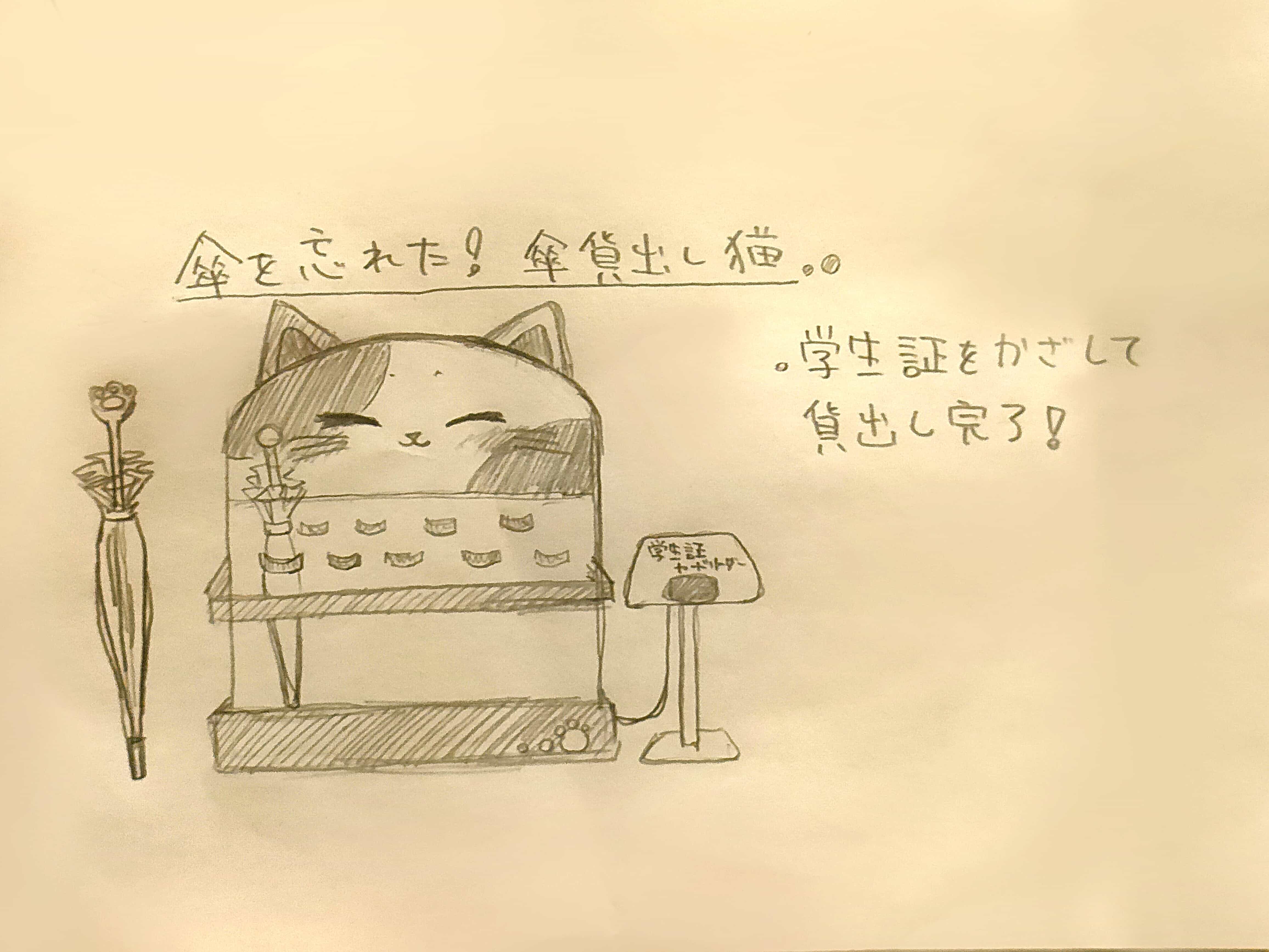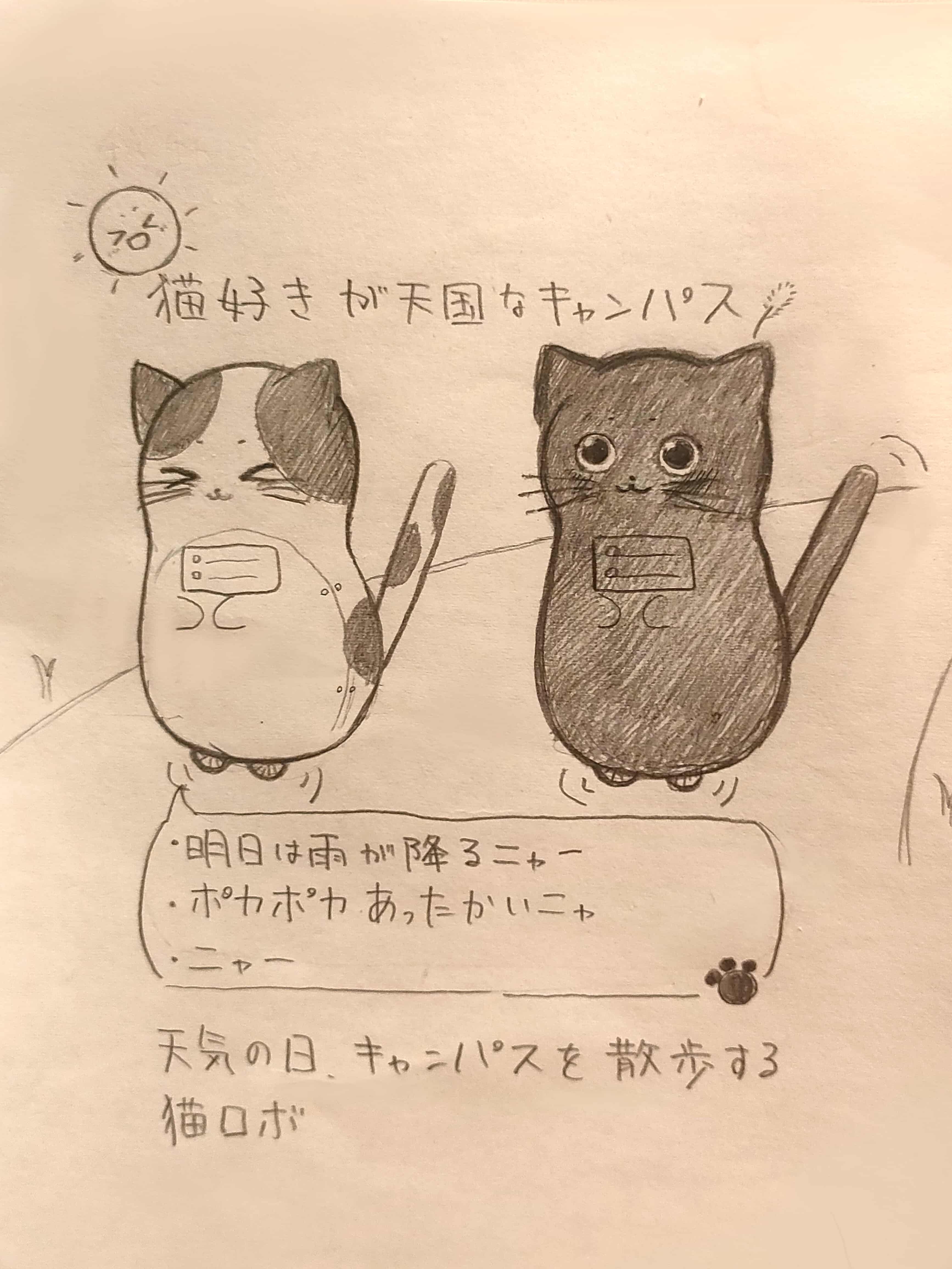 IdeaNote ↑Matsuzaki Nanami 松崎菜々実 ↑妄想キャンパス| 2024.06.13 ↑学内にかわいいかわいい猫ロボ! ↑猫を吸いたい私の欲望を詰めました ↑おなかのディスプレイ! ↑お話できる事、天気予報や現在の湿度、気温、案内マップを閲覧可能! ↑会話例 ↑話してる人間目線からしたら上目遣いになりそうでかわいい ↑傘を貸してくれるねこ ↑雨嫌いな猫だからこそのサポート😊 ↑(二週間以上返却しなければ猫ロボにしばらく嫌われます) ↑猫パワーで大学生活をのりきる!