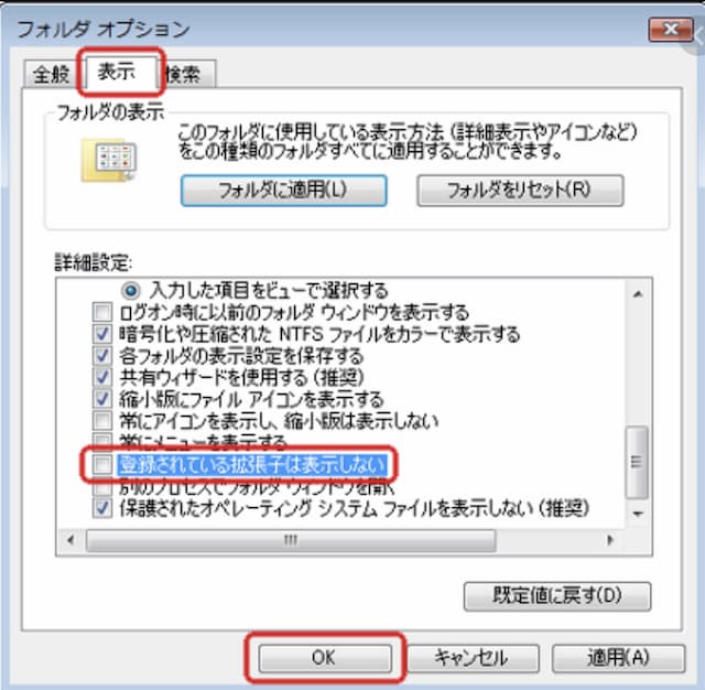 - フォルダーオプションダイアログが開くので、「登録されている拡張子は表示しない」のチェックを外して下さい。
