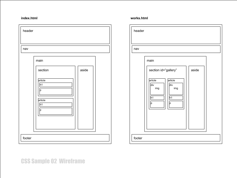 1つのCSSで全てのページを制御するという前提に立てば、全てのページでHTMLの基本構造が同一であることが必要です。このサンプルでは、標準ページ(index.html)のレイアウトに対する、例外ページ(works.html)のレイアウトを、IDの追加と、追加のCSSを書く方法で実現しています。HTMLの構造をワイヤーフレームで比較すると右のようになります。section の部分に IDを追加しただけです。