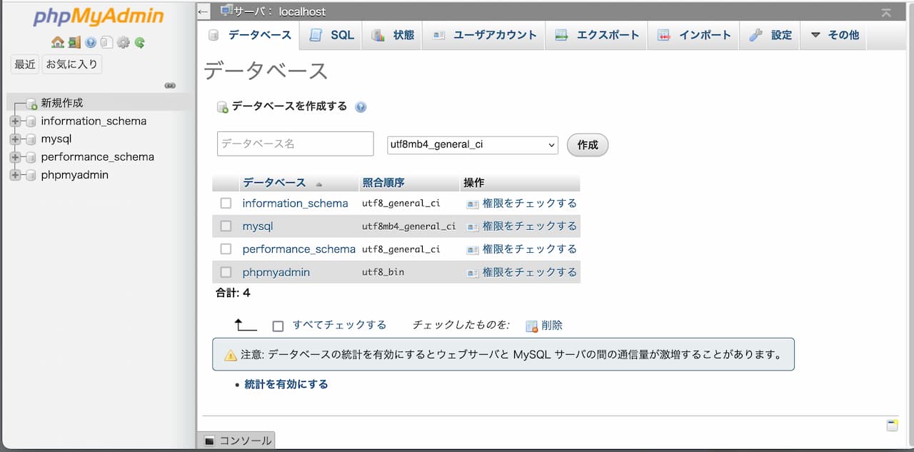 phpMyAdmin に接続すると、デフォルトで4つのデータベースがありますが、まずは、新しいデータベースを作成して、それを使って試しましょう。
