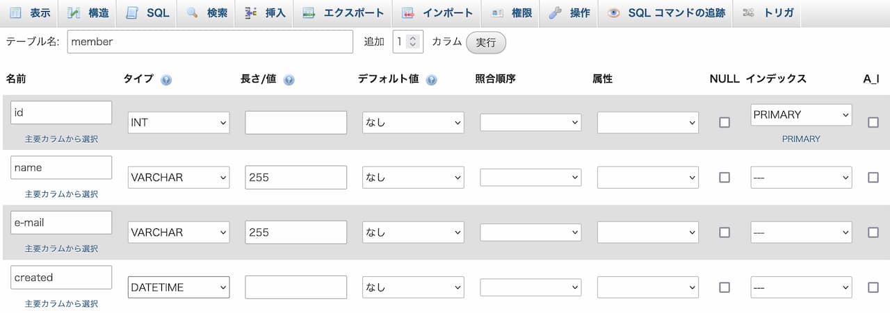 ユニークな(他とかぶらない)値なので、PRIMARY を設定して下さい。 - 名前:name、データ型:VARCHAR(255)
