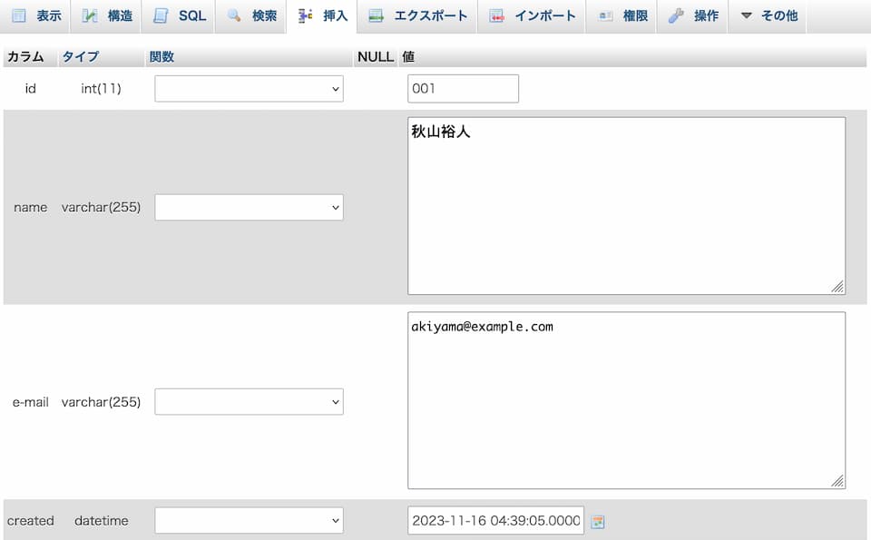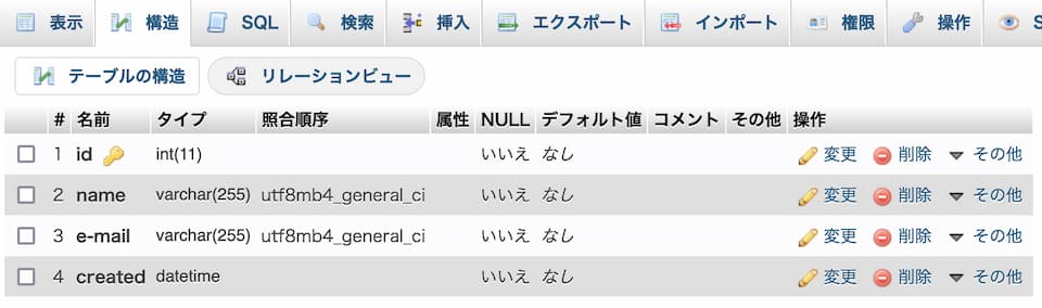 データが登録された際にその日付が自動入力されます。 - 付記:name や e-mail の型に TEXT を設定する例もあるようですが、VARCHARは固定長データとしてそのままデータベースに格納、TEXTは長文となることが前提なので、ポインタ(格納場所のアドレス)が格納される・・という違いがあります。VARCHARの方が、その後の処理は高速になります。