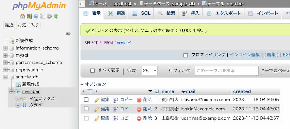 - データベース名:sample_db