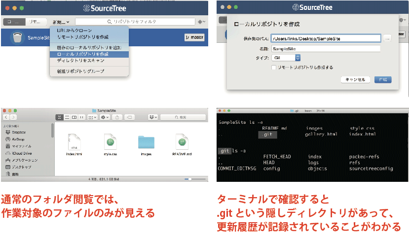 右図(クリックで拡大)は、SourceTree(後述)でローカルリポジトリを作成した例です。通常のフォルダ閲覧では、作業ファイルが見えるだけですが、ターミナルを用いてフォルダ内の隠しファイルを表示すると、そこに .git というディレクトリが見えます。更新履歴はその中に格納されています。
