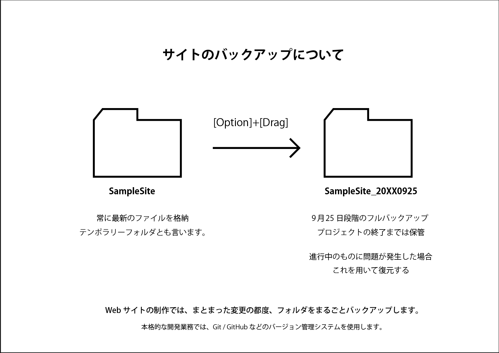 Webサイトなどのソースコードは、開発の過程で必要の都度バックアップを取るのが普通です。実務では Git / GitHub 等でバージョン管理を行いますが、大学での実習では、とりあえず、フォルダごとバックアップをとることをお勧めします。