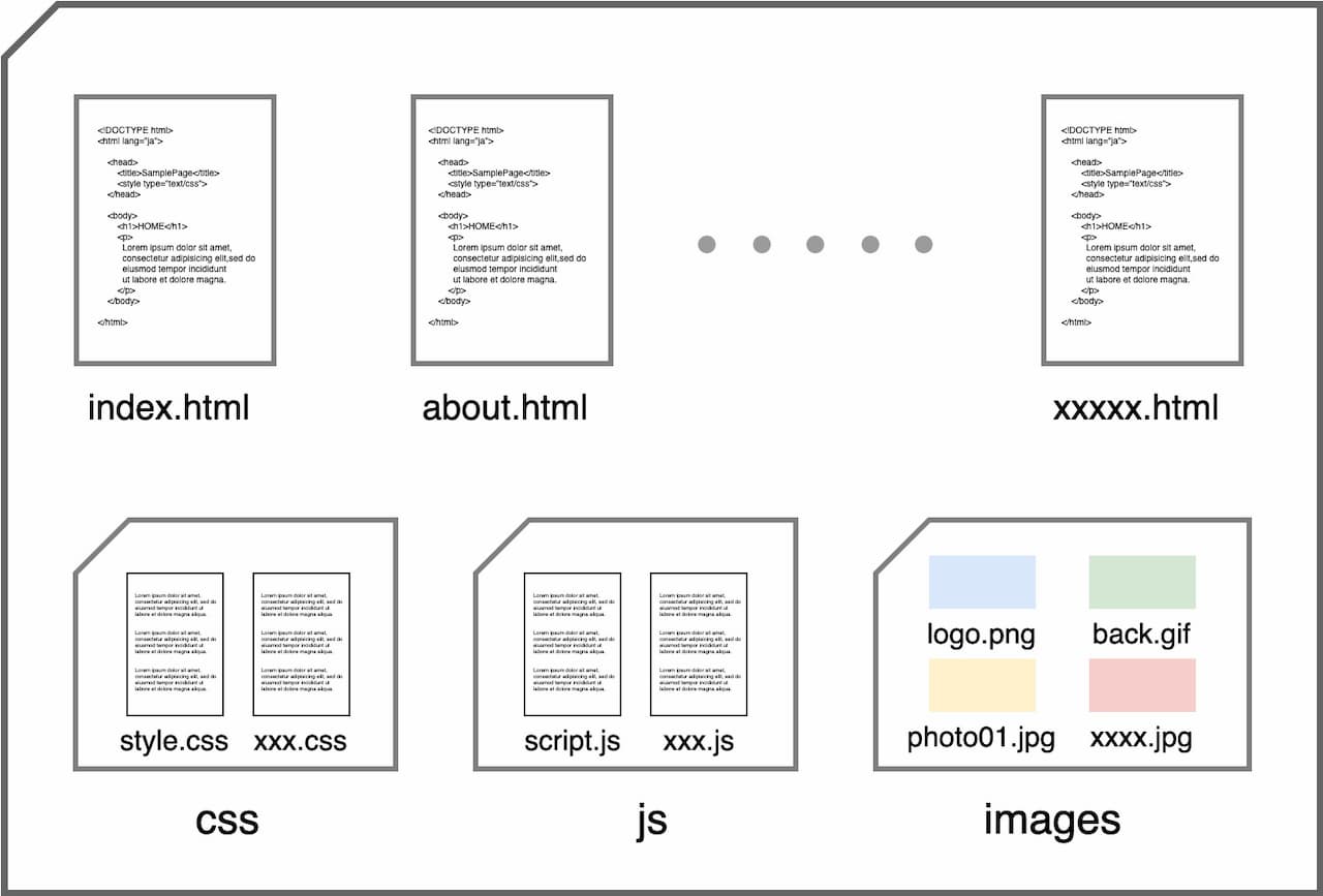 一方、Webサイトというのは、一般に複数のWebページがセットになった情報の集合体で、PC上では、ひとつのディレクトリ(フォルダ)として存在するものです(右図)。