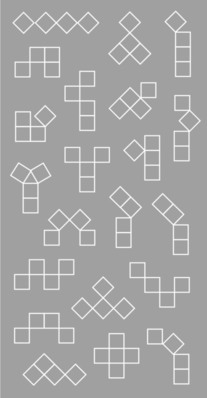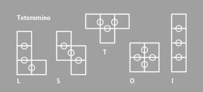 パズルの事例としてヒットした「テトロミノ」という概念も特筆すべきであろう。複数の正方形を辺でつなげた多角形を一般にポリオミノ註6)といい、正方形2つでドミノ、3つでトロミノ、そして4つでテトロミノである。ゲーム「テトリス」として有名であるが、L・S・T・O・Iの5つの型が存在し、組み合わせ方次第で、空間を隙間なく充填することができる。