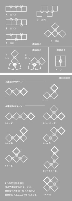 図中にある「LSTOI」などの表記は、その連結パターンから構成可能なテトロミノパターンを示している。テトロミノとの関係からいえば、連結パターンAとBは、すべての型を構成できる完全な連結方法である。Hを除くすべてのパターンでL型の構成が可能で、またFを除くすべてのパターンでO型の構成が可能である。連結点が3つのA~Eに限れば、すべてのパターンでL型とO型が構成できることも銘記すべきであろう。