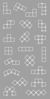 正方形の頂点間を連結するパターンを図11に示す。1つの連結点で2つの正方形を繋ぐ(連結点が3つになる)方法に5通り(A,B,C,D,E)、1つの連結点に3つの正方形をまとめて繋ぎ、残る1つを別の頂点で繋ぐ方法が2通り(F,G)、そして1つの連結点に4つの正方形を全部繋ぐ方法が1通り(H)、全部で8通りの繋ぎ方がある。尚、図の下段では、3点連結の方法が結果的にA~Eの5通りに集約されることを説明している。
