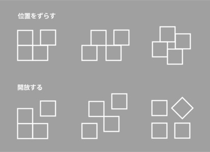 わずか4つの正方形素材でも、そうした制約条件を組み合わせて適用することで、造形的秩序を維持しつつ多様な構成の展開を考えることができる。