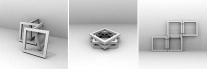 正方形の木枠の中に別の木枠を挿入することで、図の下段にあるような自立する組み合わせも可能である。図では木枠を交差させるような組み方は行っていないが、枠そのものが簡単に分解・再構成できる構造であれば、4つの交差によってさらに展開は広がるであろう。
