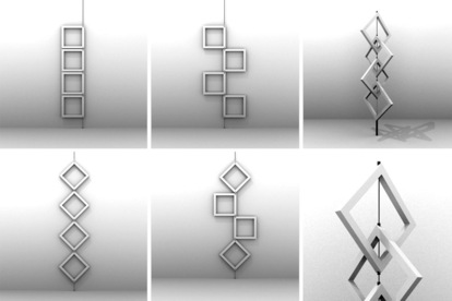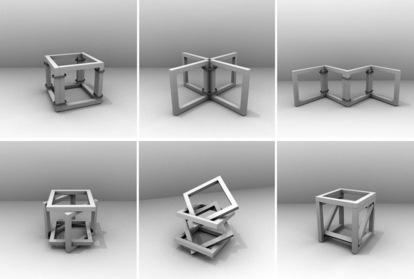 空間的な構成においては、「吊る」・「張る」といった「引張」の力も利用できる。図16の左と中央の事例は、4つの正方形木枠を3つの連結点で結束し、床と天井の双方から引張って固定したものである。引張の軸を中心とした回転も可能である。