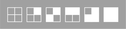 庭園や建築物のプランから家紋まで、あらゆるデザイン領域に応用される典型的な造形パターンがこの「田の字型」である。垂直・水平に2分割しただけのシンプルな構成であるが、図5に示すように、その内部を単純にON/OFF塗り分けるだけでも6通りのパターンがある。上下左右、あるいは斜め45度、135度、225度、315度の4つの向きが考えられるため、回転によって向きを変えたものを別のものとみなせば、図の左から順に1 + 4 + 2 + 4 + 4 + 1 のパターンがあって、全体で16通りになる。