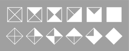正方形を対角線で分割すると4つの直角2等辺三角形ができる。これも「2×2」のひとつのかたちであり、実際に調査の過程でもそれに相当する形状がいくつか出現した。これには、対角線が垂直・水平となるように45度回転させたものも含まれる。図6は、その2つの様態を示したものである。トポロジー的には田の字型と同じであり、塗り分け方は基本的に6通り、向きを考えれば16通りのパターンがある。