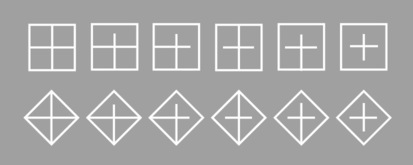 日本の家紋にける「正方形2×2」も特筆すべきであろう。特に「四つ目」には「平」「隅立て」「捻じ」「繋ぎ」「市松」などの区別があるだけでなく、余白の広さで「七つ割り」「十一割り」「十三割り」といった詳細な区別も存在する。糸を使った絞り染めの技法「目結染(鹿子染)」の形状に由来する文様で、近江源氏の佐々木一族がこの紋を使用している註7)。