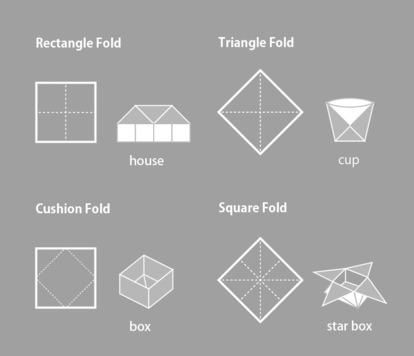 Rectangle Foldが田の字型で、Triangle FoldがX字型、他の2つはその応用である。造形的には、Square Foldから作る「鶴」が最も有名であるが、デザインのテーマとしては、「包み」や「容器」などへ応用する事例が重要であろう。事例にある「コップ」も「箱」も適正な素材を使えば実用に資する。