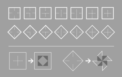 身近な事例としては、「四隅からX字型に切り込みを入れて、頂点を1つおきに中心へ移動させて軸を通す」だけで、実際に回る「風車」ができる(図右下)。簡単かつ実用的な例である。