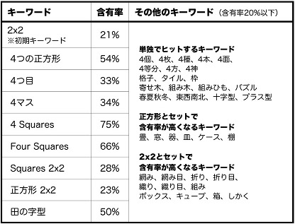 「正方形2×2」の出現に寄与するキーワードを表1に示す。表の「含有率」とは、画像検索の結果全体に対する、「正方形2×2」にふさわしい画像の割合で、逆にいえば、人物の顔写真や非正方形の商品画像を除外して残るものの割合である。