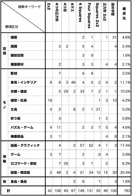 表2は、「正方形2×2」の検索に有効な8つのキーワード(含有率20%以上)ごとに、検索で現れた正方形の活用事例を、デザイン領域別にカウントした結果である。中には重複した画像も含まれるため、表の構成比が厳密に実態を物語るとは言い難いが、プロダクトデザインの領域における、家具・インテリア、衣類・雑貨、情報デザインの領域における、絵画・グラフィック、図面・概念図に多くの活用事例が見出された。