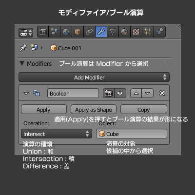 モディファイアのパネルから、Booleanを選択すると、オブジェクト同士の集合演算を行うことができます。