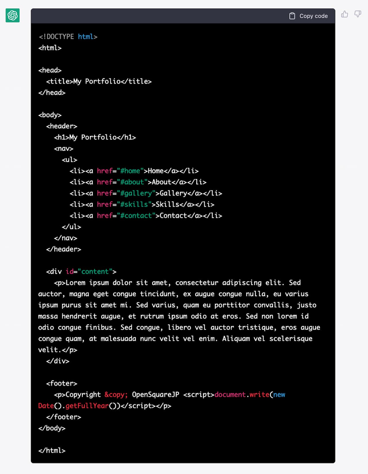 以下の内容で、ポートフォリオサイトの index.html を書いて下さい。 1) サイト名は「My Portfolio」 2) ヘッダー部分はサイト名とグローバルナビゲーション 3) グローバルナビゲーションは、Home, About, Gallery, Skils, Contact 4) コンテンツ領域には、ダミーテキスト 5) フッター部分には、コピーライトの表記(OpenSquareJP)と年月 以上