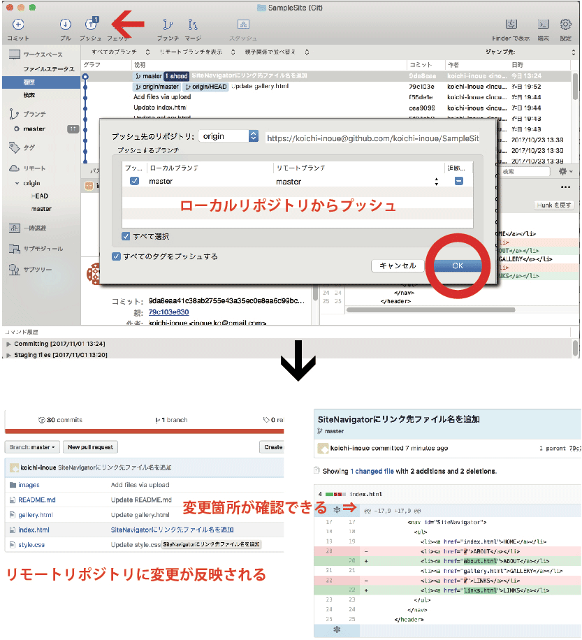 右図(クリックで拡大)は、ローカルの変更をリモートにプッシュする様子です。ahead という表記は、ローカルの作業がリモートに先行していることを意味し、この状態でプッシュが可能です。プッシュが反映されると、GitHub上でもコミット単位での変更点が確認できます。
