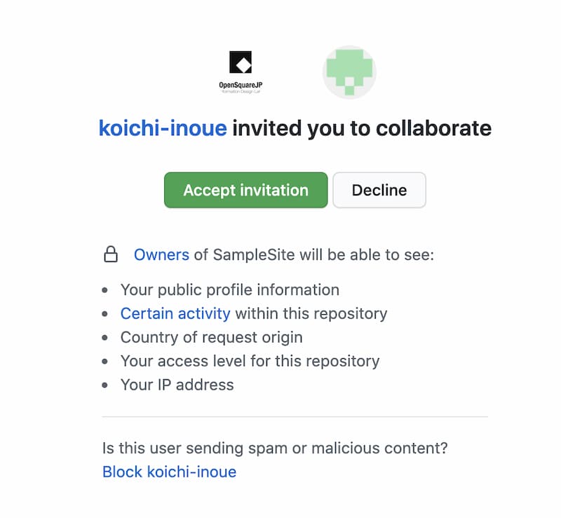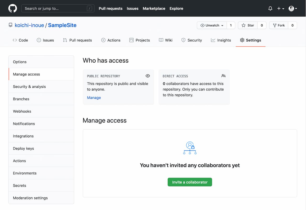 共同編集を行うには、当該リポジトリに招待相手の GitHubアカウントを指定して招待作業を行う必要があります。