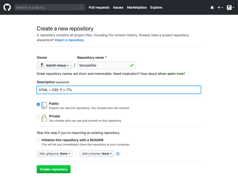 - 2. Repository nameという入力欄にリポジトリ名を入力します。リポジトリ名は任意ですが、ここで設定した名称によって、WebサイトのURLが変わります。一般に以下のようなURLになります。