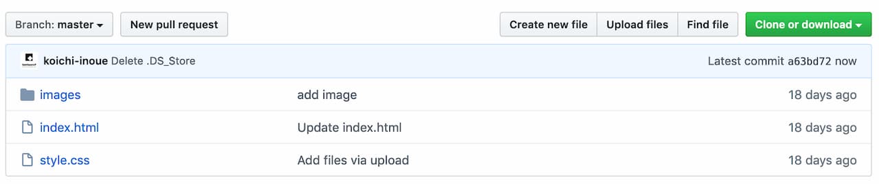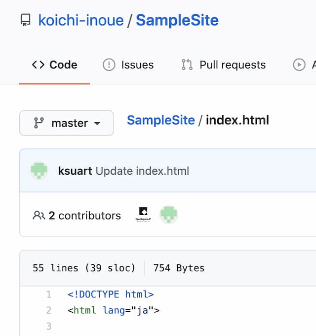 Enumerating objects: 4, done. Counting objects: 100% (4/4), done. Delta compression using up to 4 threads Compressing objects: 100% (2/2), done. Writing objects: 100% (3/3), 348 bytes | 348.00 KiB/s, done. Total 3 (delta 0), reused 0 (delta 0) To https://github.com/koichi-inoue/SampleSite.git aeb9e0b..ff11e2b master -> master