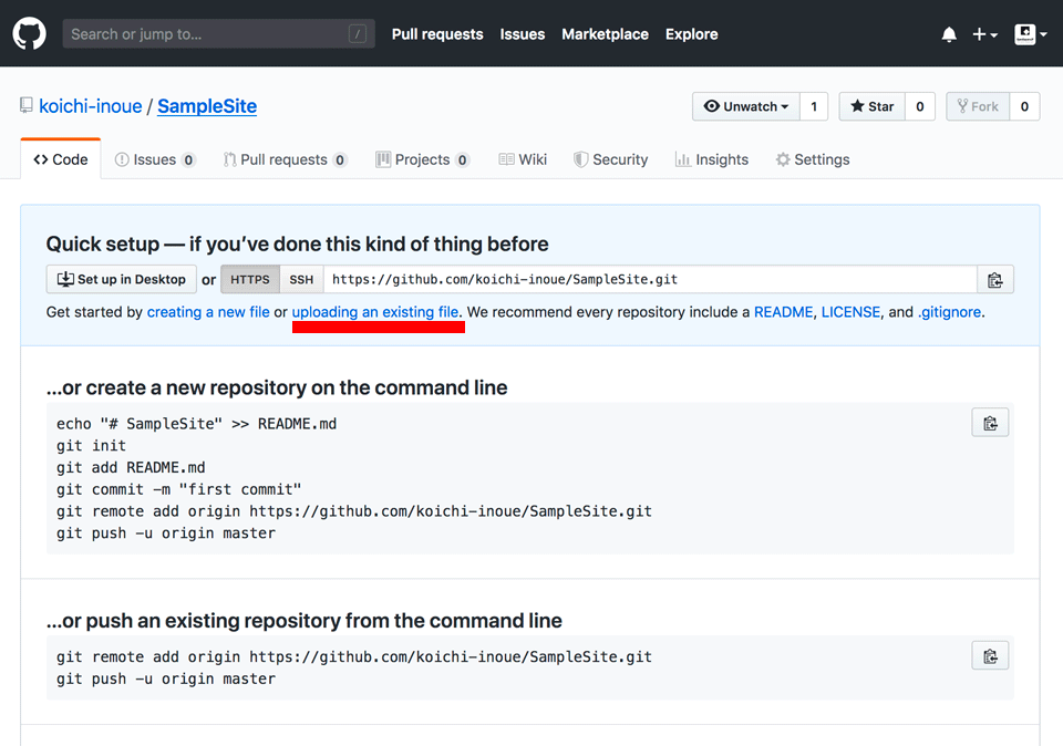 上記でコピーしたURLを以下のように使います$ git clone https://github.com/koichi-inoue/SampleSite.git Cloning into 'SampleSite'... : Unpacking objects: 100% (42/42), done.