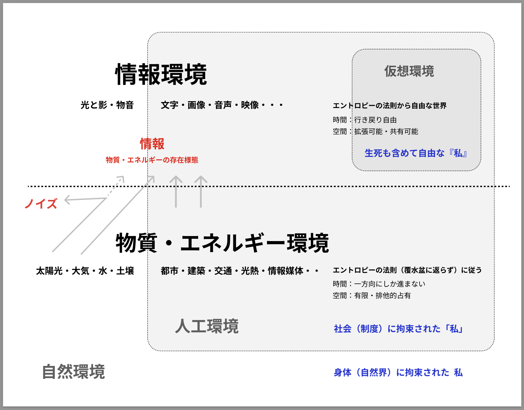 議論の枠組を筆者なりの視点で整理したものを図1に示す。自然環境と人工環境を区別するとともに、物質・エネルギー環境と情報環境(仮想環境を含む)とを大別した。情報は、物質・エネルギーとして存在する「媒体」の上に、何らかのパターンとして存在し、我々の情報環境を構成している。