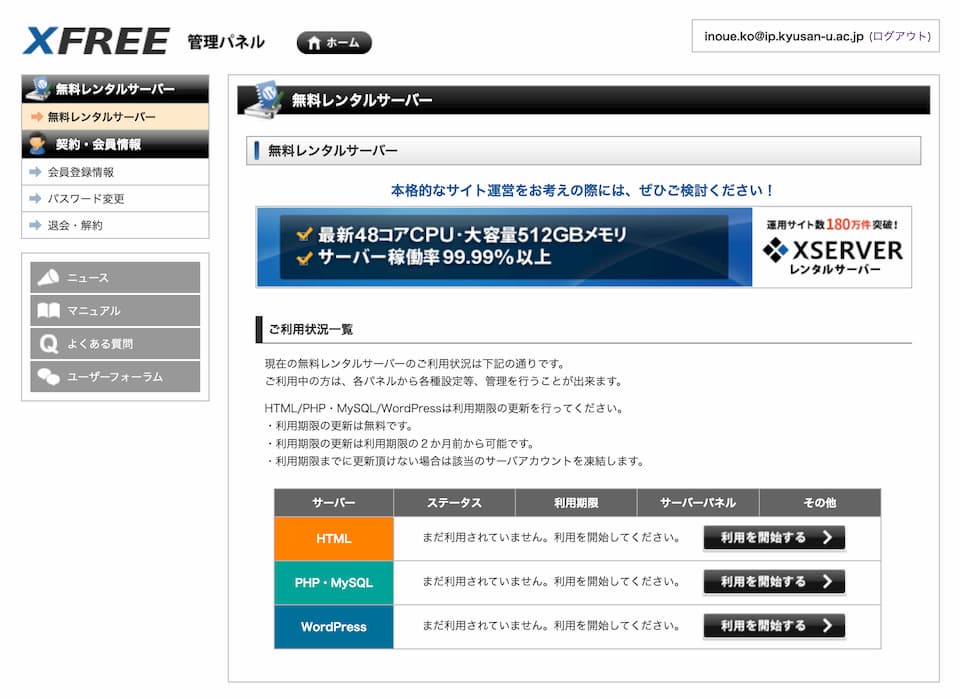 - HTMLサーバー の部分で「利用を開始する」をクリックして下さい。