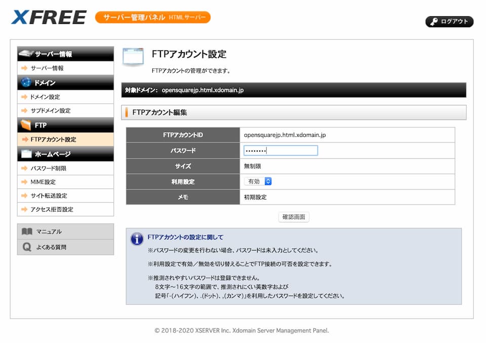 - X-Freeでは、FTPアカウント名は、サイトのURLと同じ文字列が設定されます。これをメモしておきましょう。
