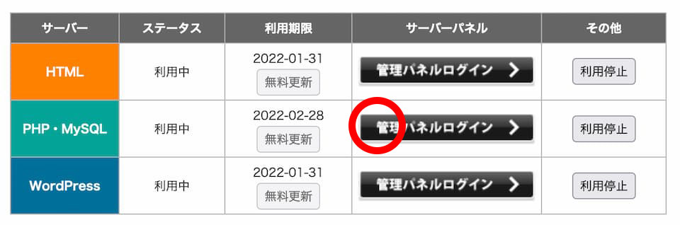 - PHP+MySQLサーバー の部分で「利用を開始する」とすると、右のように「管理パネルにログイン>」というボタンが表示されます。