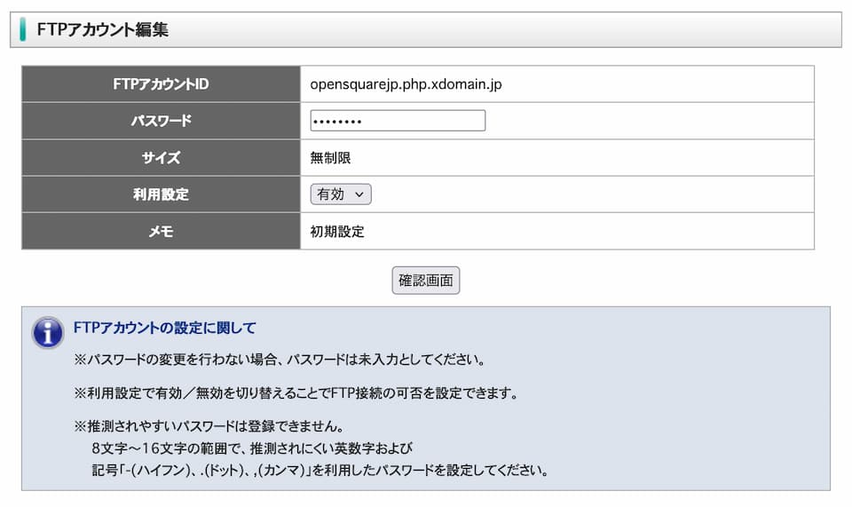 - パスワード:FTPパスワード
